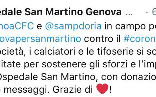 A differenza di quanto provano a farci credere gli idioti che hanno rovinato lo striscione esposto tra Bergamo e Brescia, di questi tempi non esiste nessuna rivalità. Lo dimostra questo tweet del Policlinico San Martino di Genova, che ha ringraziato pubblicamente i club della città e i loro tifosi per il grande sforzo (non solo economico) fatto finora a sostegno dell’ospedale.