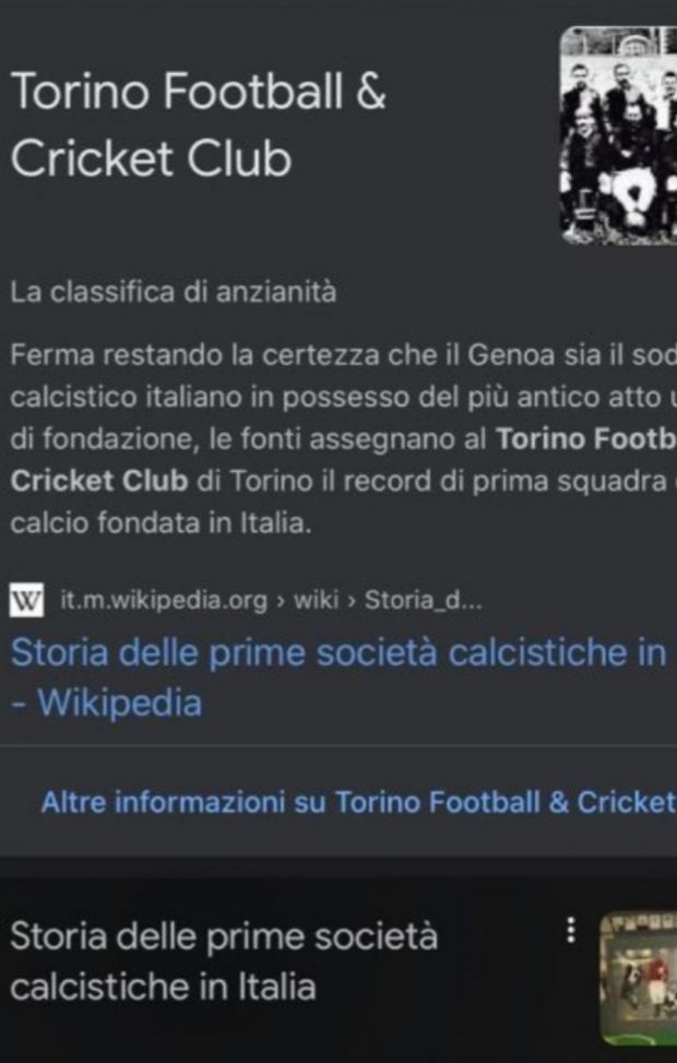 Su Wikipedia leggiamo: “Ferma restando la certezza che il Genoa sia il sodalizio calcistico italiano in possesso del più antico atto ufficiale di fondazione, le fonti assegnano al Torino Football & Cricket Club di Torino il record di prima squadra di calcio fondata in Italia”. Che dire? Ci dispiace, ma anche questo primato non gli appartiene…".
