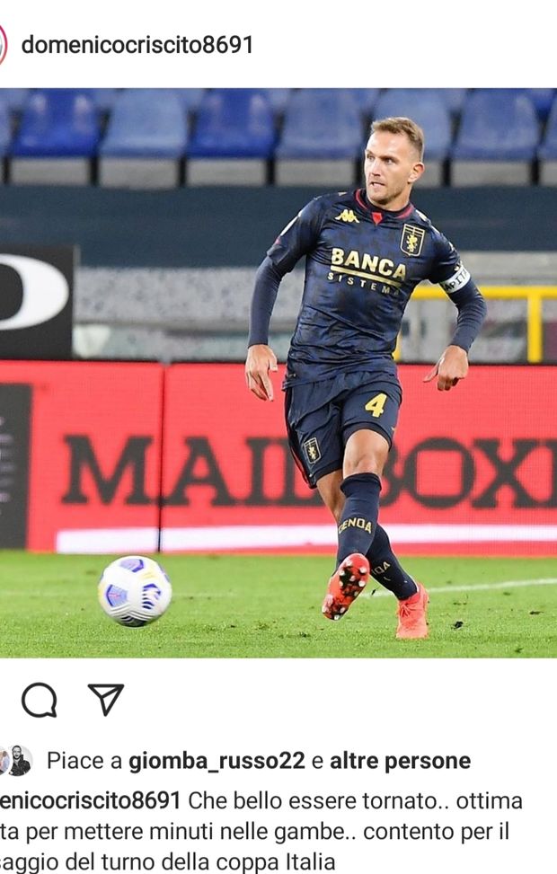 Il Genoa ha battuto 2-1 il Catanzaro e si è regalato il derby con la Sampdoria nel prossimo turno di coppa Italia. Prima però c'è quello di campionato...Domenico Criscito è tornato in campo dopo le due settimane trascorse in isolamento a seguito della positività al Covid-19 e ha espresso tutta la sua felicita per il ritorno su Instagram: “Che bello essere tornato! Ottima partita per mettere minuti nelle gambe, sono contento per il passaggio del turno in Coppa Italia”.