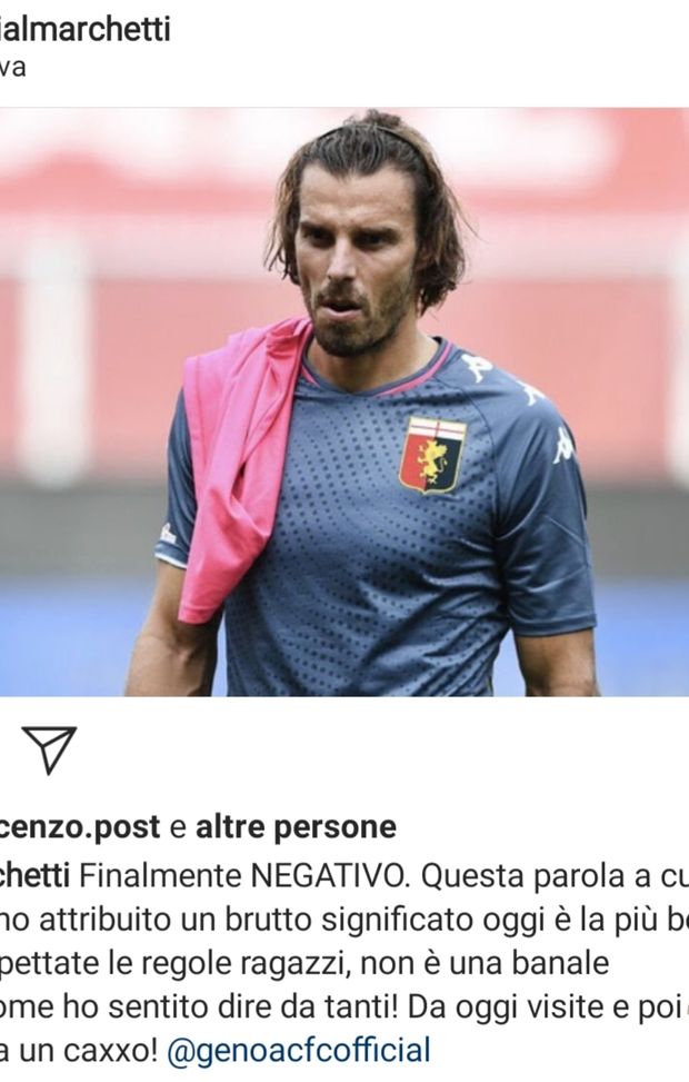 Marchetti ha lanciato un messaggio a poche ore dalla buona notizia arrivata con una nota medica. “Finalmente sono negativo – scrive il portiere del Genoa su Instagram – Questa parola a cui da sempre ho attribuito un brutto significato oggi è la più bella di tutte. Rispettate le regole ragazzi, non è una banale influenza come ho sentito dire da tanti! Da oggi visite e poi…non si molla niente!”.