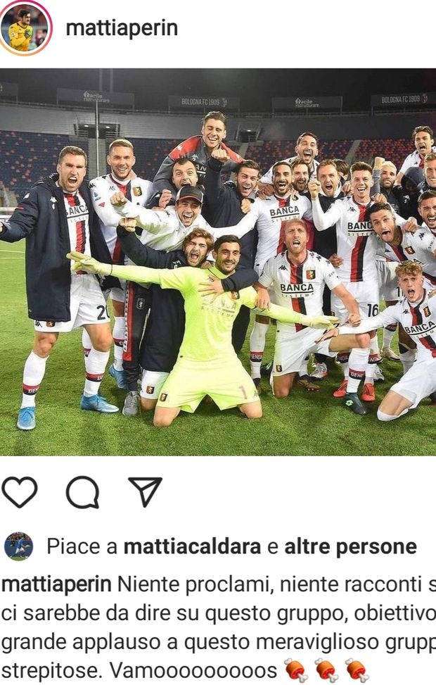 Mattia Perin, capitano a Bologna e protagonista ormai di più di duecento presenze con la maglia del Grifone, ha scritto sul suo profilo Instagram: “Niente proclami, niente racconti su quanto di bello ci sarebbe da dire su questo gruppo. Obiettivo raggiunto e un grande applauso a questo meraviglioso gruppo di persone strepitose. Vamos“.