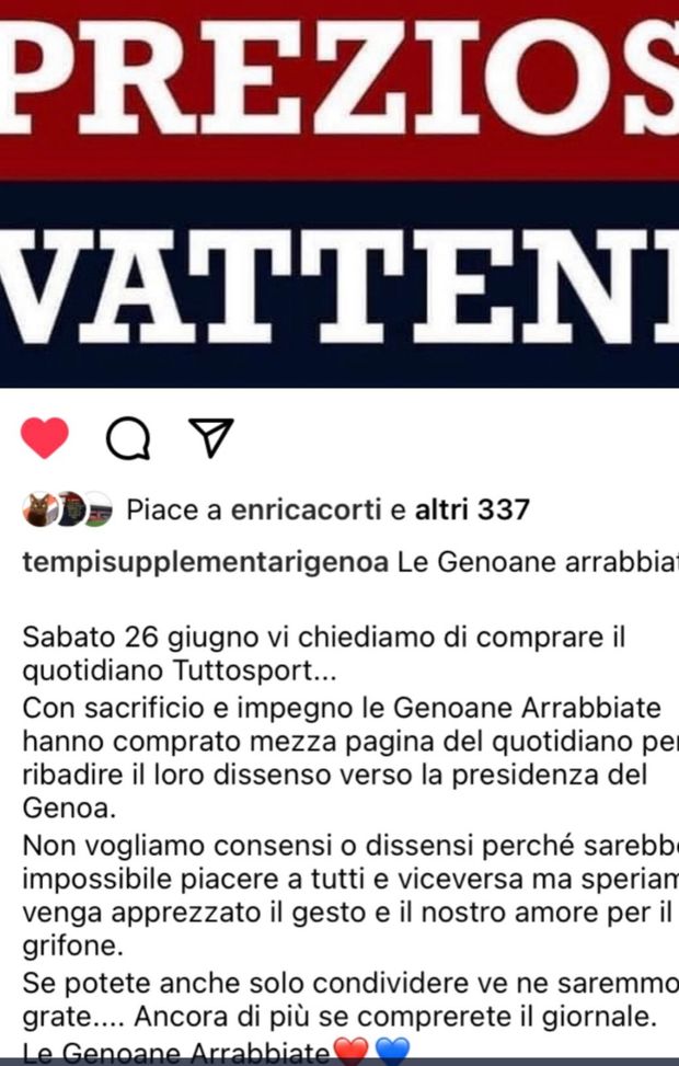 Un gruppo di tifose del Genoa, che si firmano "le Genoane Arrabbiate", ha comprato una pagina sul giornale sportivo nazionale Tuttosport per far pubblicare una lettera aperta contro Enrico Preziosi, attuale proprietario e presidente del Genoa