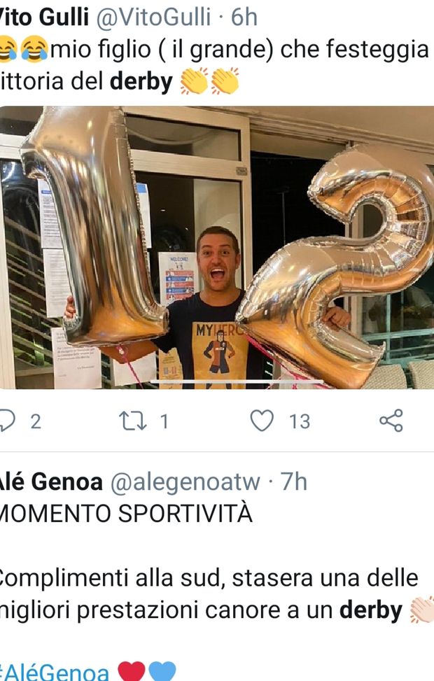 Questa volta tocca ai tifosi genoani inondare i social. Dopo tanti bocconi amari causati dei derby, dopo l'1-2 firmato Criscito e Lerager i tifosi del Grifone si sono davvero scatenati, trascinanti dalle parole del tecnico, Davide Nicola.