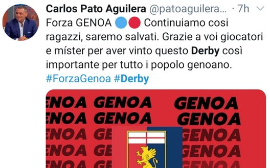 Subito dopo il derby giocato a ridosso dell'inaugurazione del nuovo Ponte di Genova, dall'Uruguay, anche Pato Aguilera si è congratulato con i rossoblù.