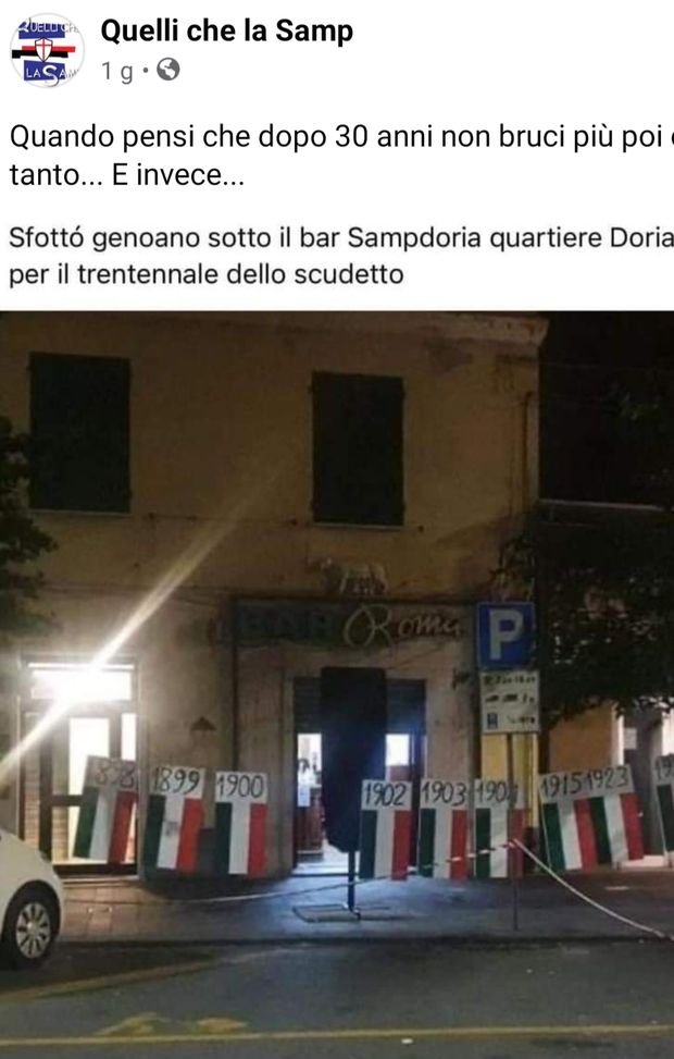 Il Bar Roma non è mai casuale, perché lì si sono svolte le riunioni in vista della fusione della Sampierdarenese Calcio con l’Andrea Doria, culminata con la nascita, il 12 agosto, della Sampdoria. E proprio lì, i tifosi genoani hanno affisso nove scudetti, quelli del Genoa, a rimarcare la rivalità cittadina.