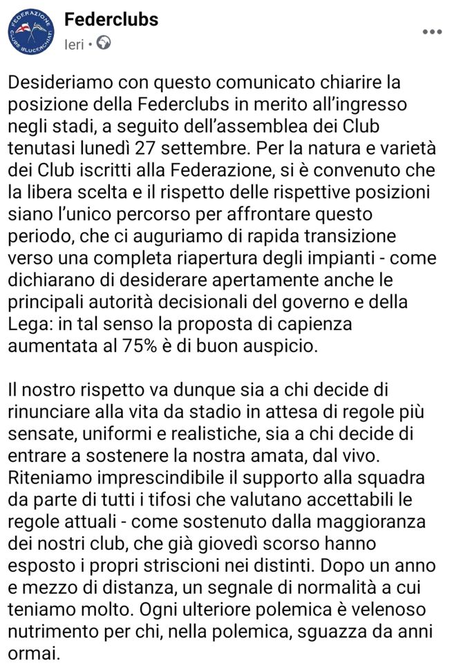 La Federclubs sampdoriana e il delicato tema dell'entrata allo stadio dei gruppi organizzati. Pochi giorni fa gli Ultras hanno ribadito che fino a quando l'apertura degli stadi non arriverà al 100% la Gradinata Sud resterà vuota. Con un comunicato la Federclubs ha spiegato la situazione: "Desideriamo con questo comunicato chiarire la posizione della Federclubs in merito all’ingresso negli stadi, a seguito dell’assemblea dei Club tenutasi lunedì 27 settembre. Per la natura e varietà dei Club iscritti alla Federazione, si è convenuto che la libera scelta e il rispetto delle rispettive posizioni siano l’unico percorso per affrontare questo periodo, che ci auguriamo di rapida transizione verso una completa riapertura degli impianti – come dichiarano di desiderare apertamente anche le principali autorità decisionali del governo e della Lega: in tal senso la proposta di capienza aumentata al 75% è di buon auspicio. Il nostro rispetto va dunque sia a chi decide di rinunciare alla vita da stadio in attesa di regole più sensate, uniformi e realistiche, sia a chi decide di entrare a sostenere la nostra amata, dal vivo. Riteniamo imprescindibile il supporto alla squadra da parte di tutti i tifosi che valutano accettabili le regole attuali – come sostenuto dalla maggioranza dei nostri club, che già giovedì scorso hanno esposto i propri striscioni nei distinti. Dopo un anno e mezzo di distanza, un segnale di normalità a cui teniamo molto. Ogni ulteriore polemica è velenoso nutrimento per chi, nella polemica, sguazza da anni ormai".