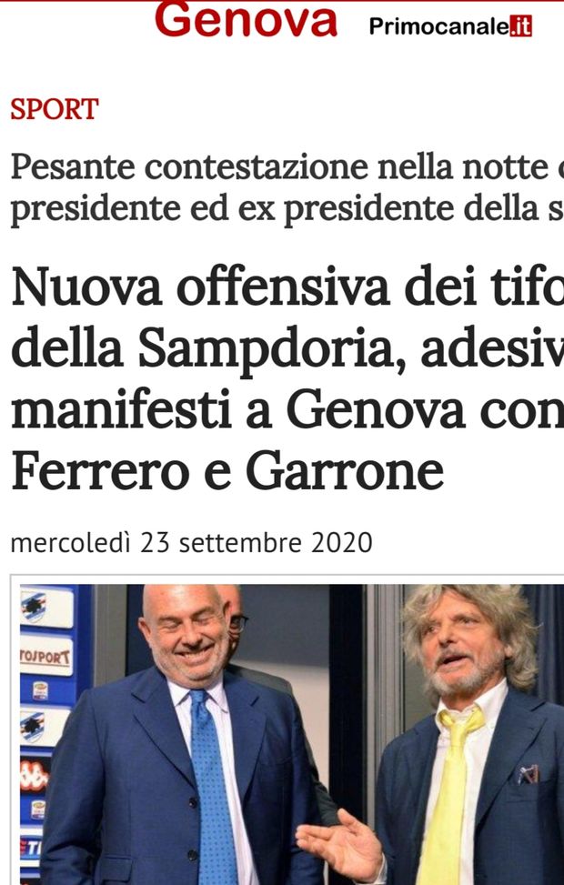Nuova, pesante offensiva dei tifosi della Sampdoria, che nel corso della notte hanno tappezzato la città di Genova con adesivi e manifesti contro il presidente Massimo Ferrero e l'ex presidente Edoardo Garrone, ritenuto responsabile di avere ceduto nel 2014 la società blucerchiata al successore. Gli adesivi e i manifesti, dal contenuto molto duro, sono comparsi in varie zone della città e stanno anche già facendo il giro del web.