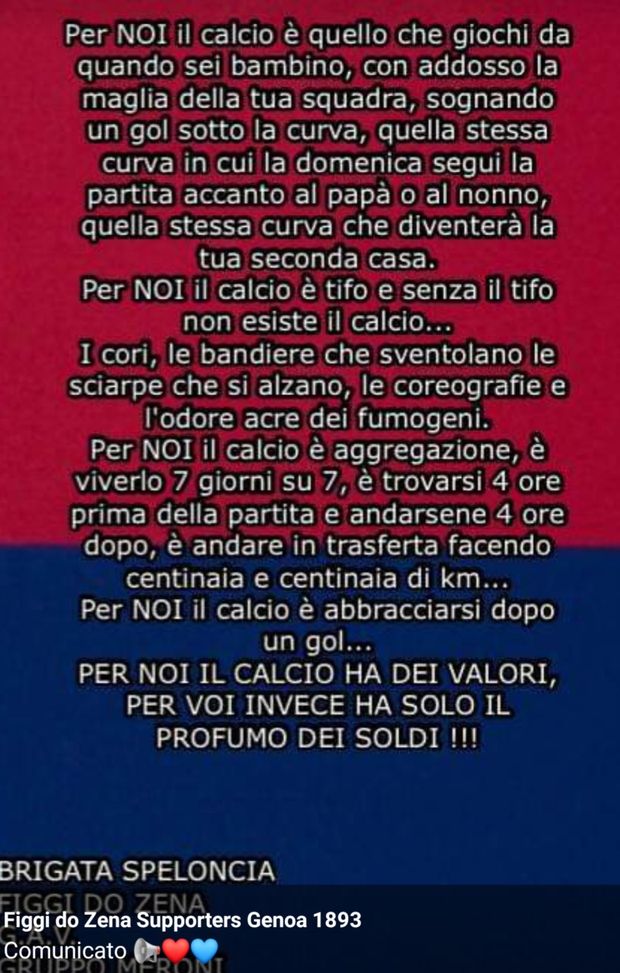 Ecco il testo dei tifosi ultras del Grifone: "Per NOI il calcio è quello che giochi da quando sei bambino, con addosso la maglia della tua squadra, sognando un gol sotto la curva, quella stessa curva in cui la domenica segui la partita accanto al papà o al nonno, quella stessa curva che diventerà la tua seconda casa. Per NOI il calcio è tifo e senza il tifo non esiste il calcio… I cori, le bandiere che sventolano, le sciarpe che si alzano, le coreografie e l’odore acre dei fumogeni. Per NOI il calcio è aggregazione, è viverlo sette giorni su sette, è trovarsi quattro ore prima della partita e andarsene quattro ore dopo, è andare in trasferta facendo centinaia e centinaia di chilometri… Per NOI il calcio è abbracciarsi dopo un gol…. PER NOI IL CALCIO HA DEI VALORI, PER VOI INVECE HA SOLO IL PROFUMO DEI SOLDI!!!". Vale la pena ricordare che i club calcistici in Italia sono fortemente indebitati e che se si torna a giocare, lo si fa per limitare i tremendi danni economici della pandemia. In ogni caso il comunicato porta la firma delle componenti del tifo del Genoa: Brigata Speloncia, Figgi do Zena, GAV, Gruppo Meroni, Old Block, Spartani Ponente e ACG.