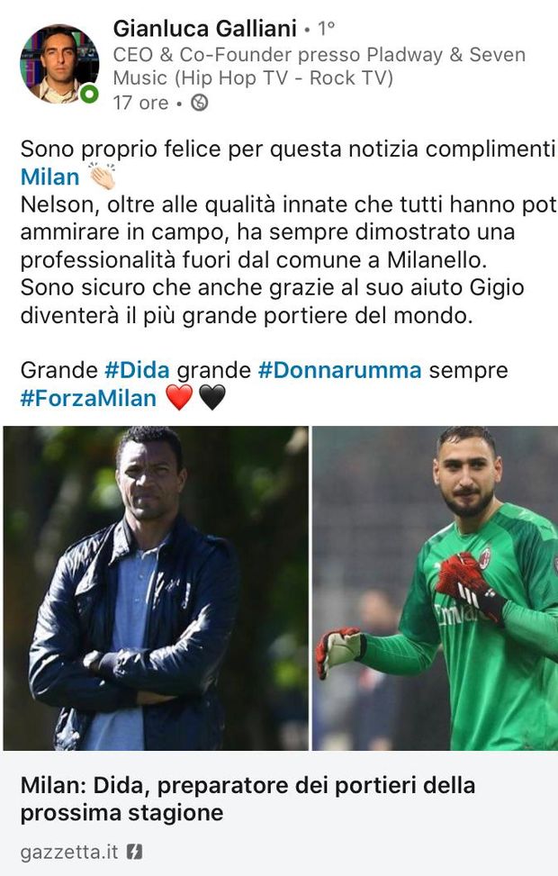 Questa scelta ha determinato l'applauso social, sul proprio profilo Linkedin, di Gianluca Galliani, figlio di Adriano, storico ad del Milan. Dopo alcune polemiche del passato relative ai "dirigenti con un monte salariale che rappresenta un unicum nella storia del calcio mondiale", questa volta Gianluca Galliani ha apprezzato, condiviso e applaudito. Nelson Dida è il classico prototipo del portiere che si è formato con l'allenamento e con il lavoro, proprio ciò che viene chiamato a fare con Gigio e con il team dei portieri rossoneri 2020-2021.
