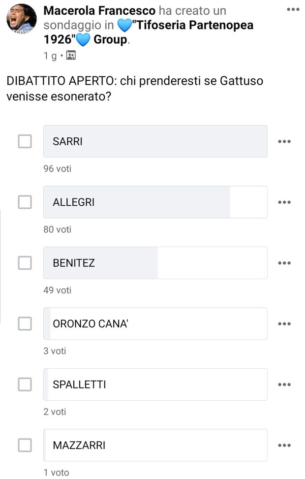 E' un piccolo campione, basato su poche centinaia di tifosi. Ma a suo modo indicativo, rispetto alla ferita aperta da Sarri nel cuore di Napoli al momento del suo passaggio alla Juventus. Un sondaggio Facebook fra tifosi indica che, rispetto ad Allegri (anche lui ex juventino) e Benitez (anche lui cavallo di ritorno...), molti napoletani preferiscono ancora Sarri, in caso di esonero di Rino Gattuso.