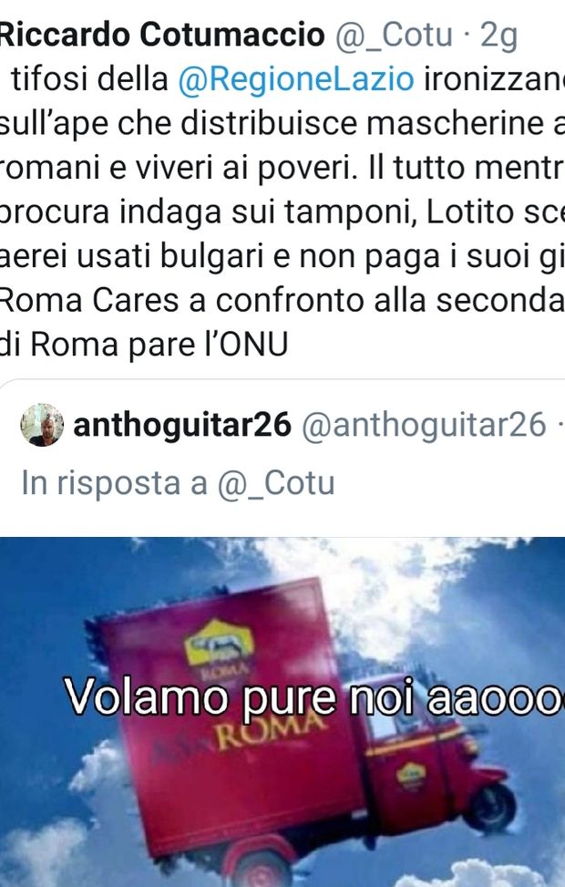 I tifosi romanisti rispondono così alle ironie dei tifosi biancocelesti della Lazio sulla Ape giallorossa che, tramite la fondazione giallorossa Roma Cares, distribuiscono da fine ottobre 10mila mascherine ai bambini e ragazzi di trenta scuole della Capitale.