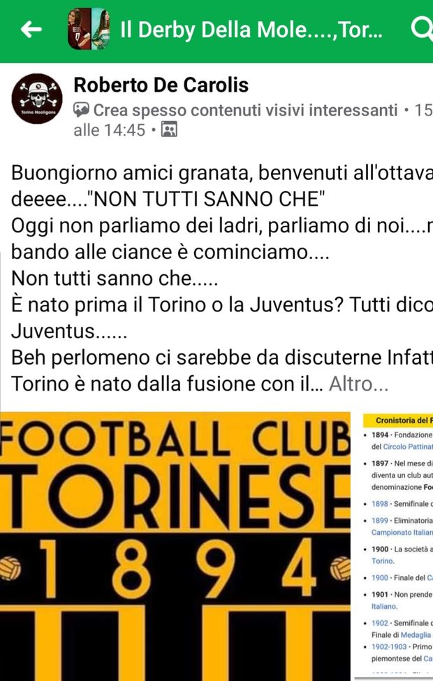 E già che ci siamo...la finale di Roma persa dai bianconeri ha dato la stura anche ad un post di rilettura storica. Roberto De Carolis, tifoso granata, sostiene che non sia vero che la Juventus sia nata prima del Torino, visto che i granata sono stati fondati dopo una fusione con la U.S. Torinese che esisteva già dal 1894...tre anni prima della fondazione della Juventus...che cosa non scatena una finale di Coppa...