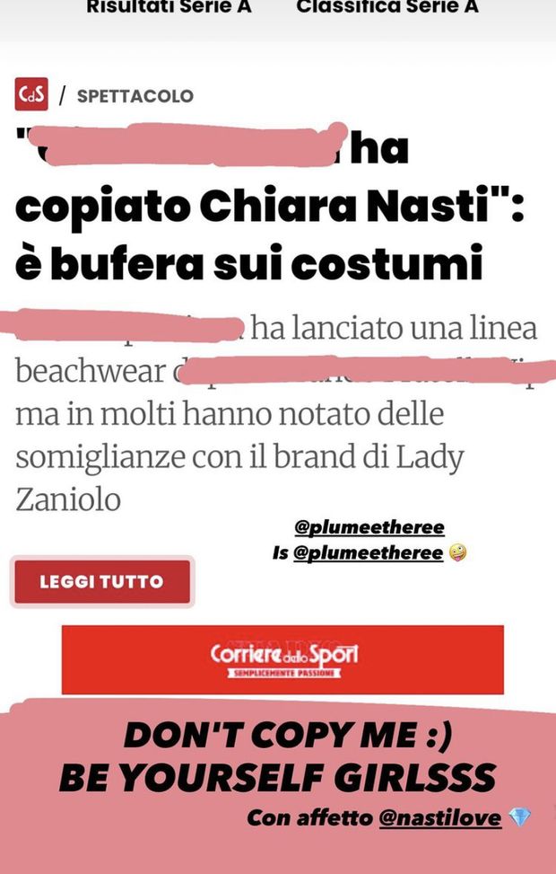 La Salemi ha infatti realizzato una nuova linea di costumi, nulla di male fin qui, se non fosse che tale linea risulta troppo simile ai costumi firmati dalla Nasti. Immediato lo sdegno di lady Zaniolo, postato senza mezzi termini sul proprio profilo IG. Al momento non è ancora arrivata la risposta “rossonera”, ma la sensazione è che non tarderà molto…