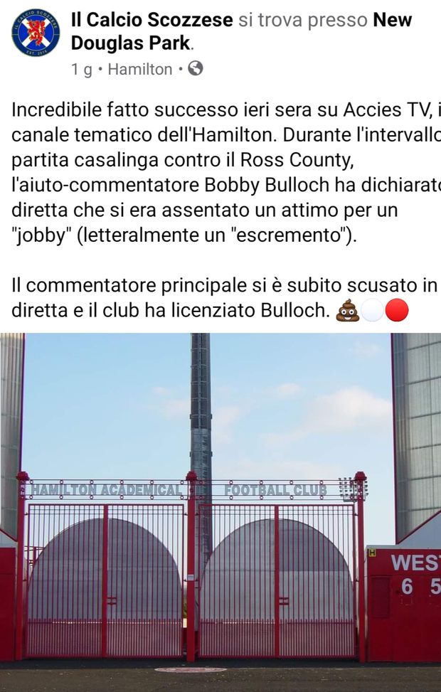 Un commentatore di calcio, su Accies TV, canale tematico ufficiale dell'Hamilton, è stato licenziato dopo aver annunciato di essere tornato in onda in ritardo per il secondo tempo dopo essere andato in toilette per un "lavoro". Bobby Bulloch pensava di essersi fatto una risata annunciando i suoi movimenti durante l'intervallo tra Hamilton Academical e Ross County (ospiti vittoriosi 2-1 in Premiership scozzese) mercoledì sera: ha detto al suo co-commentatore che era "andato via per un lavoro a metà tempo". Un termine gergale usato in Scozia per la cacca. "Non ho premuto il pulsante della diretta quando sono tornato, quindi mi scuso con chiunque non mi abbia ascoltato in questi primi minuti di questo secondo tempo".