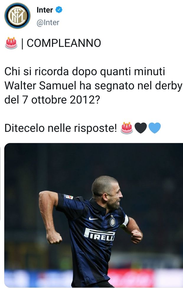 Nato il 23 marzo 1978, Walter Samuel oggi compie 43 anni. Il profilo Twitter ufficiale dell'Inter ha scelto un derby giocato a Milano a ottobre per celebrare la giornata del proprio ex campione.