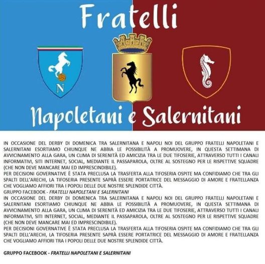 Dopo una settimana di tensioni interne alla Salerno calcistica, di tensioni social e di questioni relative alla trasferta dei tifosi partenopei all'Arechi, bloccata dal Governo dopo i fatti sull'autostrada, è nato un gruppo Facebook della serenità e della concordia.