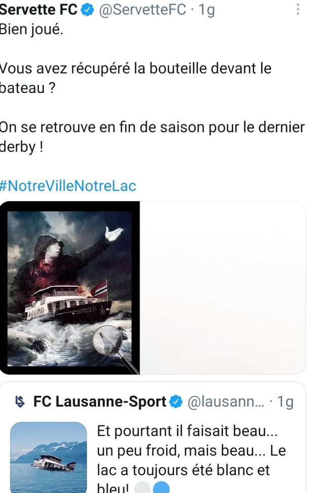 I granata del Servette si sono poi complimentati continuando la diatriba sul possesso del lago, ma i vodesi del Losanna hanno rincarato la dose postando il getto d'acqua tipico di Ginevra che si sta spegnendo.