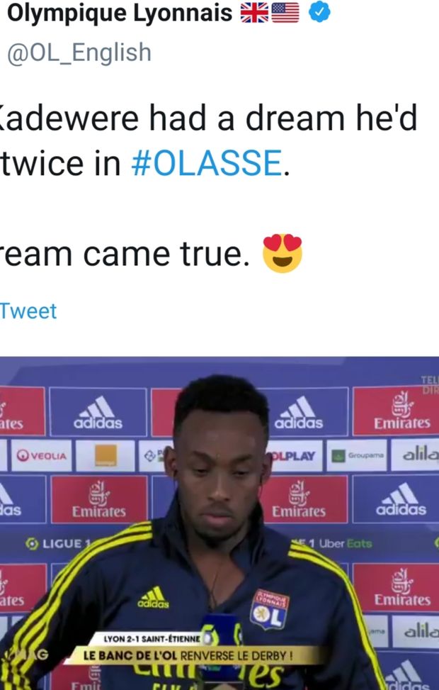 In panchina al calcio d'inizio per la prima volta in un mese, Tino Kadewere ha rovesciato il derby con i Verdi, fino al 2-1 finale contro il Saint Etienne, con una doppietta risultata decisiva domenica. "Se lo merita, l'uomo è apprezzato da tutti", ha detto di lui Rudi Garcia, dopo il derby della rimonta all'OL Park,
