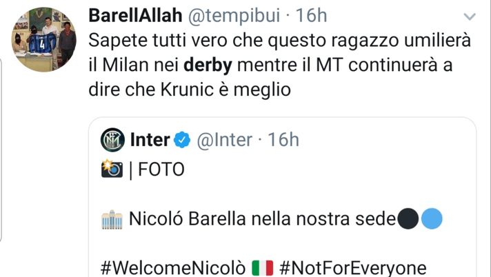 E' partito il profilo BarellAllah con l'account @tempi bui, riferendosi proprio a Nicolò Barella: "Sapete tutti vero che questo ragazzo umilierà il Milan nei derby mentre il Milan Twitter continuerà a dire che Krunic è meglio"