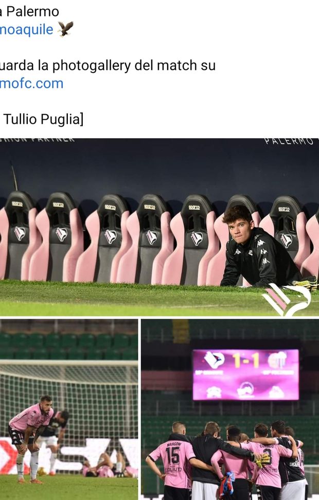 Queste le parole scritte dal club rosanero: “Ce lo ricorderemo a lungo il derby di ieri. Soprattutto l’immagine di quella panchina vuota, mentre i nostri undici eroi correvano in campo su ogni pallone, sapendo di non potersi fermare. Mai. Neanche per un secondo. Undici soldati, da soli. E invece no. Soli mai: ognuno lo scudo dell’altro, ognuno i muscoli dell’altro, ognuno l’abbraccio dell’altro. E attorno a loro, centinaia di migliaia di cuori rosanero a Palermo e in ogni parte del mondo, a sostenerli e incitarli. Passeranno le difficoltà e rimarrà, dentro, la forza di questo orgoglio”.