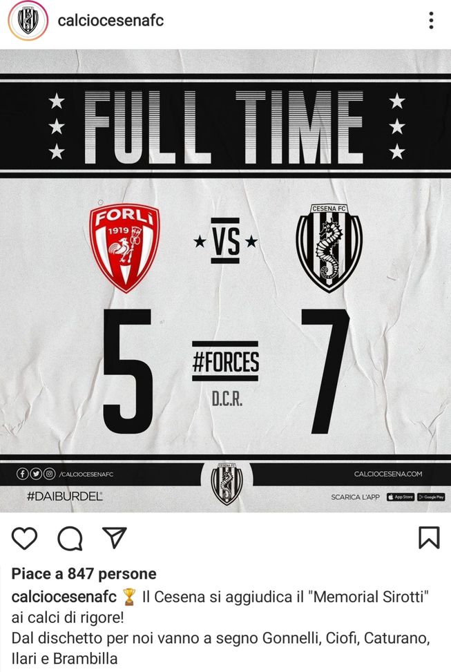 La lotteria dei rigori premia il Cavalluccio, implacabili dal dischetto Gonnelli, Ciofi, Caturano, Ilari e Brambilla, come conferma Cesenatoday.it. Una partita gradevole in cui il Forlì ha tenuto testa ad un Cesena in campo con diversi giovani, non sfigurando nonostante la differenza di categoria, visto che i cesenati militano in Serie C e i forlivesi in Serie D. Tra le due squadre e le due tifoserie, c'è una grande rivalità.