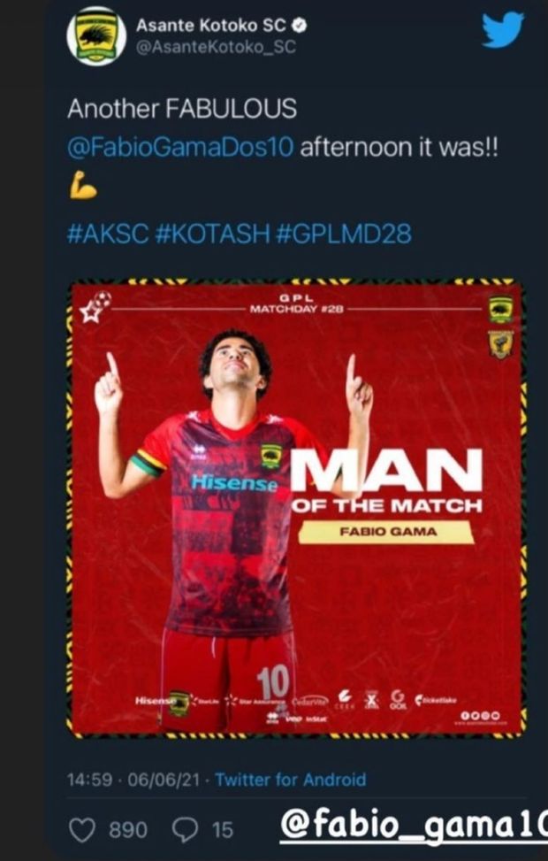 L'ex attaccante dell'Asante Kotoko, Eric Bekoe, ha paragonato proprio l'autore del gol, il regista Fabio Gama, alla superstar argentina Lionel Messi. Gama, che si è unito ai Porcupine Warriors prima dell'inizio della Premier League del Ghana 2020/21, è stato un toccasana per il club. Il brasiliano è stato impressionante nella sua stagione d'esordio per il club. Gama è stato applaudito da molti per la sua compostezza, il suo controllo di palla e la sua lettura del gioco. E Bekoe, che ha vinto la massima serie con il club durante la sua permanenza, crede che il 28enne sia un buon giocatore e possieda le qualità di Messi che rendono difficile per gli avversari giocare contro di lui: "Fabio Gama è un tipo di giocatore simile a Lionel Messi", ha detto come riportato da 3Sports. "Quando la palla raggiunge il terzo offensivo, dovrai trovarlo perché è un buon assist-man, un buon controllore di palla e ha tutte le componenti", ha aggiunto.