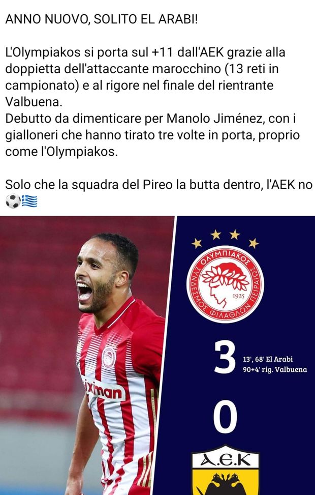 L'Olympiacos è stato migliore per gran parte della partita, segnando una doppietta con Youssef El Arabi (13' e 68') e resistendo alla pressione dell'AEK (prima gara dopo l'esonero di Massimo Carrera) nella ripresa, con un gol annullato a Petros Mandalos un minuto prima del secondo gol del marocchino. Ma il rigore di Mathieu Valbuena, come riporta la pagina Facebook Il Calcio Greco, al 94' certifica i tre punti della squadra del Pireo che rimane al primo posto in classifica. La squadra di Pedro Martins è sei punti sopra l'Aris, che oggi gioca a Lamia contro la squadra locale, ma anche sette sul PAOK, fermato sul pari (1-1) con l'AEL ad Alkazar.