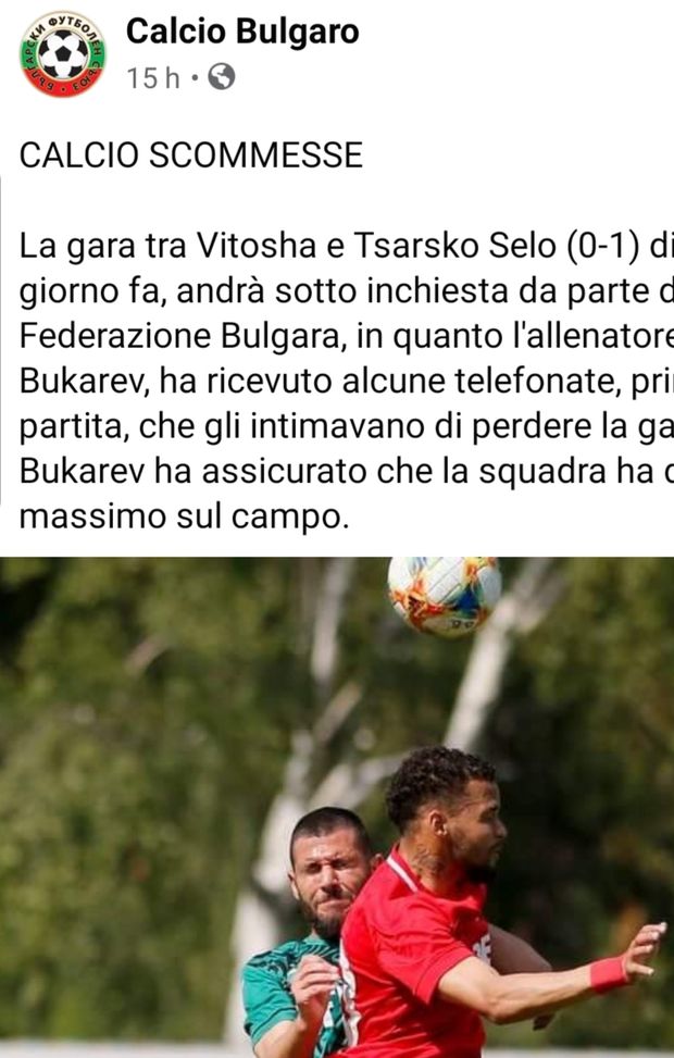 Il presidente della Commissione per l'etica e il fair play nell'Unione calcistica bulgara, il generale Vasil Vassilev ha dichiarayo che sarà investigata la partita del massimo campionato bulgaro Vitosha Bistritsa-Tsarsko Selo: 0-1 il risultato finale La notizia arriva dopo che l'allenatore della squadra sconfitta, Asen Bukarev, ha ammesso che al Vitosha è stato chiesto più volte di dare la partita all'avversario, che sta combattendo per la partecipazione ai playoff per l'Europa League: "Confermo le parole di ieri. Le conversazioni che ho avuto con conoscenti comuni erano informali, in un'atmosfera informale. Mi hanno chiesto in tono molto amichevole se avremmo potuto giocare in maniera morbida, se avessimo potuto evitare di dare il massimo, magari schierando qualche giovane in più- Non incolpo il club Tsarsko Selo, perché non ho parlato direttamente con loro. Abbiamo giocato in ogni caso al 100%, e lo faremo giovedì contro Etar", ha dichiarato Bukarev a Sportal.bg.
