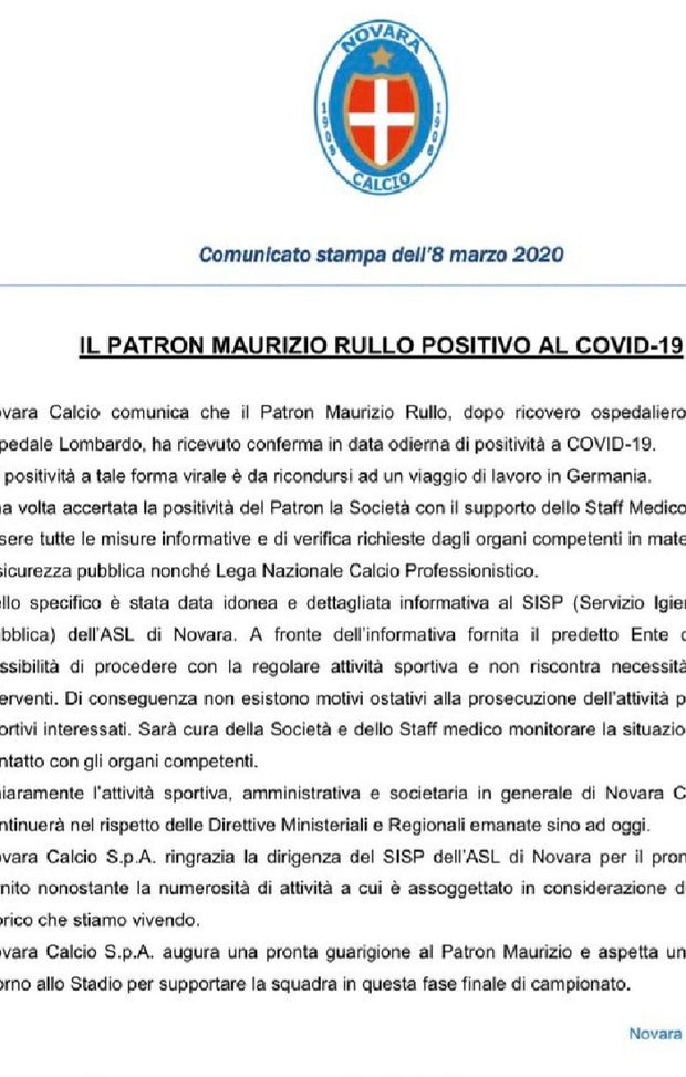 Maurizio Rullo, patron del Novara calcio, è stato contagiato dal Coronavirus. Il presidente è infatti risultato positivo al tampone.