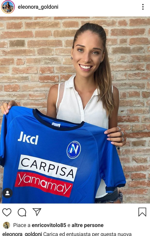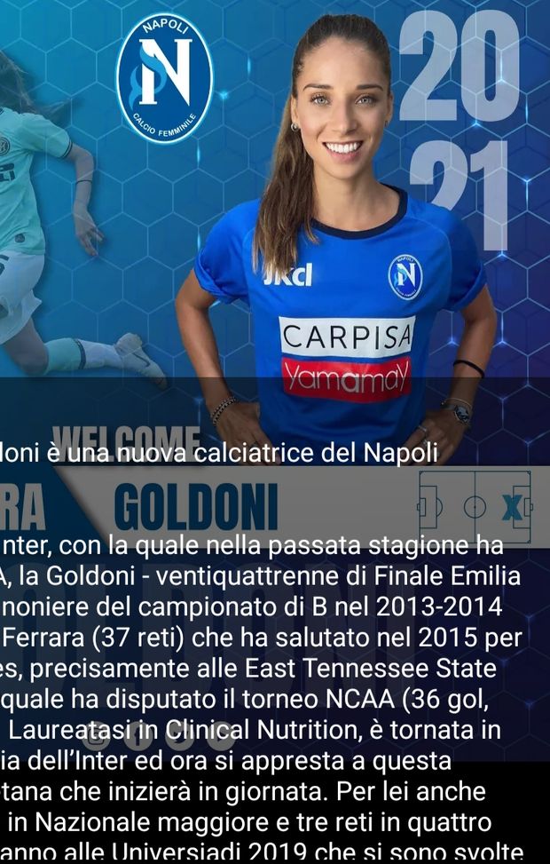 Eleonora Goldoni ha ventiquattro anni ed è una nuova calciatrice del Napoli. Ha continuato a giocare anche nel 2013 quando si è trasferita in America, dove ha studiato alla East Tennessee State University di Johnson City, in Tennessee, ed è entrata fra le fila della squadra universitaria, le Lady Buccaneers. La carriera della Goldoni era già iniziata...all’età di 7 anni, nel Finale Emilia, la squadra della sua città. Nel 2009, poi, Il New Team Ferrara, dove è rimasta fino al 2015. Dopo aver giocato la serie C, la serie B e aver anche vinto il titolo di capocannoniere nel 2013, ecco le Lady Buccaneers, squadra universitaria.