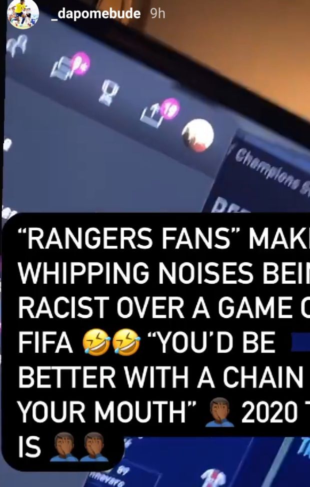 Il promettente 19enne della nazionale scozzese giovanile, che ha scalato le fila dell'accademia del club, ha fatto la sua denuncia sui social media ieri sera, affermando su Twitter: "Alcuni fan di 'Rangers' sono razzisti nei confronti della mia famiglia per una partita di FIFA". Ha fornito ulteriori dettagli, sostenendo che gli è stato detto "torna ai campi di cotone" e "faresti meglio con una catena in bocca" e si sentivano anche rumori audio di frusta. Proprio così, un video sul suo Instagram sembra mostrare un avversario online che fa schioccare la frusta.
