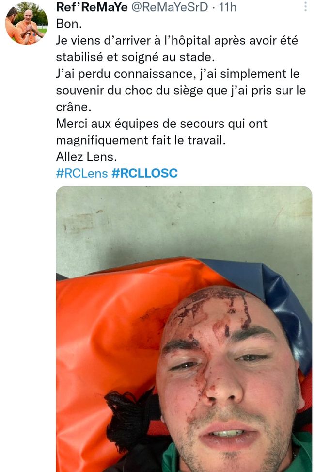 Un tifoso del Lens, nella foto, ha raccontato su Twitter: "Sono appena arrivato in ospedale dopo essere stato stabilizzato e curato allo stadio. Ho perso conoscenza, ricordo solo lo shock del sedile che ho preso sulla testa. Grazie alle squadre di soccorso che hanno svolto il lavoro magnificamente. Allez Lens".