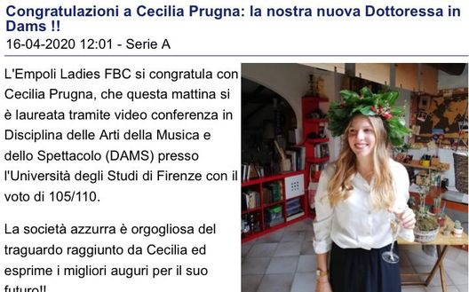 Qui Empoli Ladies, la calciatrice Cecilia Prugna si è laureata ieri mattina tramite video conferenza in Disciplina delle Arti della Musica e dello Spettacolo (DAMS) presso l'Università degli Studi di Firenze con il voto di 105/110.