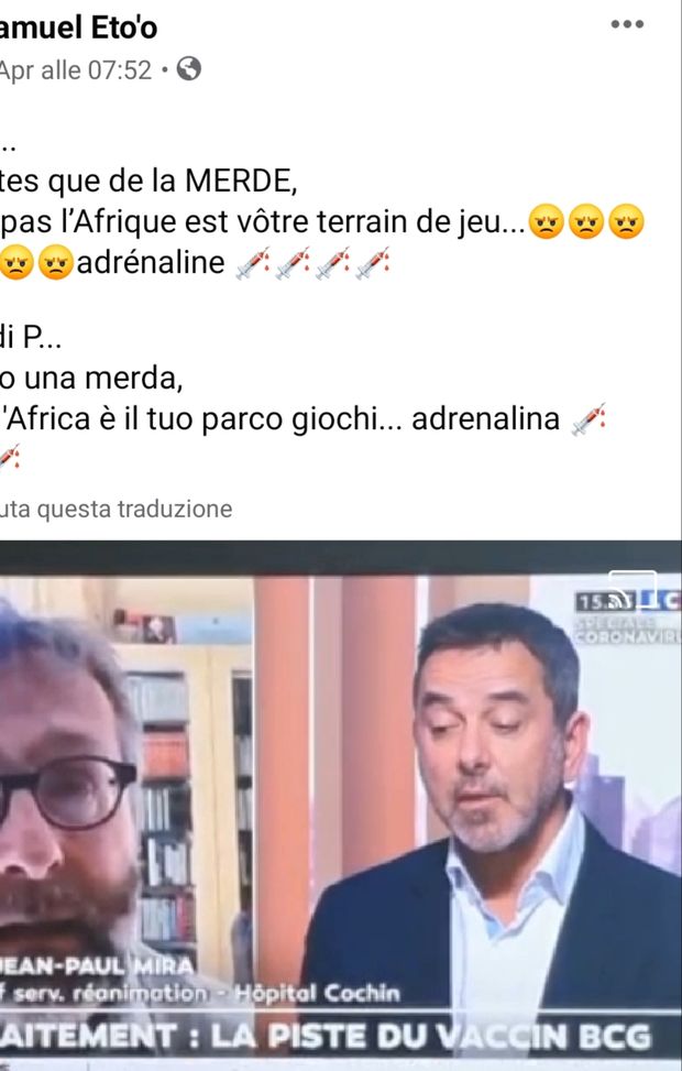 Nello specifico, il dr. Jean-Paul Mira e il dr. Camille Locht, rispettivamente capo del reparto di rianimazione dell’ospedale Cochin e direttore della ricerca all’Inserm (Institut national de la santé et de la recherche médicale), discutevano sulla potenziale efficace contro Covid-19 del vaccino BCG, utilizzato contro la tubercolosi. In particolare, tra le possibilità avanzate vi è stata quella di effettuare dei test a tal riguardo in Africa. “Figli di p… - ha scritto Eto’o su Facebook - non siete altro che merde. L’Africa è il vostro territorio di gioco”.