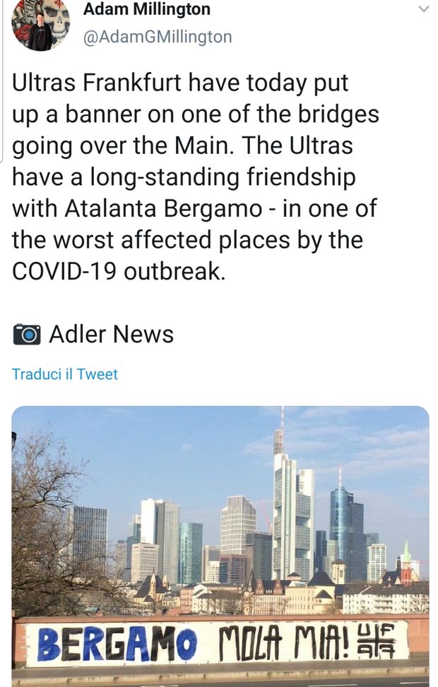 Gli Ultras dell'Eintracht Francoforte hanno inviato saluti e incoraggiamenti verso Bergamo con uno striscione appeso sul Meno. La città del nord Italia è particolarmente colpita dal Coronavirus. Vero che gli Ultras di Atalanta sono gemellati con quelli dell'Eintracht, ma evidentemente la fama europea dell'Atalanta collegata al dramma che sta vivendo la città ha indotto i tifosi dell'Eintracht a dare particolare risalto al loro gesto.