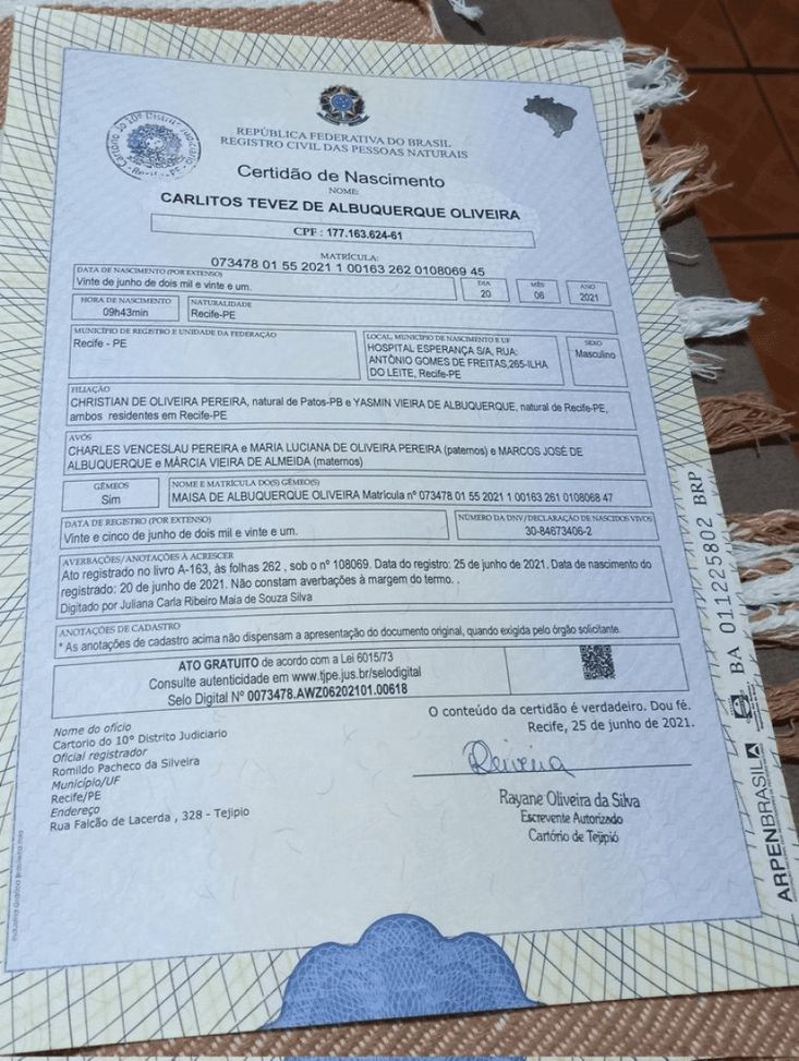 Sui social network, infatti, è diventata virale la nascita di Carlitos Tevez de Albuquerque Oliveira. È un bambino nato in Brasile venerdì 20 agosto a Recife, capitale dello Stato del Pernambuco.