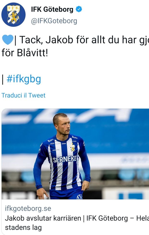 Jakob Johansson è costretto a porre fine alla sua carriera calcistica e il suo club, il Goteborg, lo saluta a dovere. Le sue parole: "Ho molti ricordi fantastici con i Blåvitt. Idealmente, mi sarebbe piaciuto essere un po' più in campo. Adesso posso invece venire a seguire la squadra da tifoso".