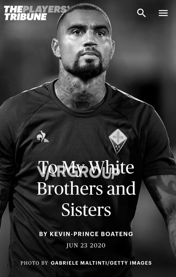 Kevin Prince Boateng è noto per essere un ragazzo che non le manda a dire. Tesi confermata nella lettera scritta dal ghanese e pubblicata sul The Players' Tribune, intitolata “Ai miei fratelli e alle mie sorelle bianchi”.