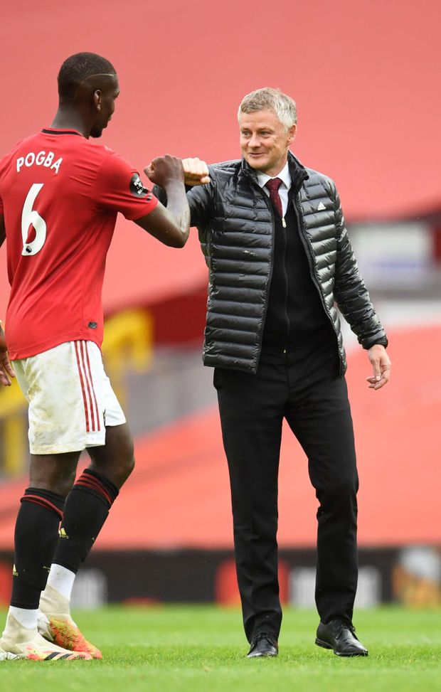 MANCHESTER, ENGLAND - SEPTEMBER 19: Ole Gunnar Solskjaer, Manager of Manchester United greets Paul Pogba of Manchester United as he is substituted off during the Premier League match between Manchester United and Crystal Palace at Old Trafford on September 19, 2020 in Manchester, England. (Photo by Shaun Botterill/Getty Images)