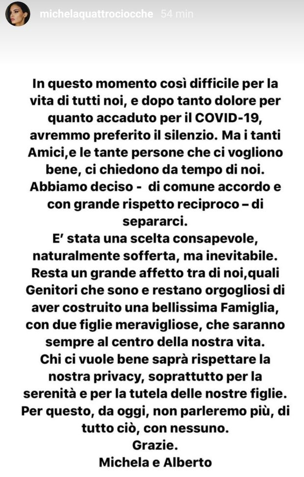 La notizia è arrivata nella tarda mattinata attraverso i profili Instagram sia dell'attrice che del collaboratore tecnico della Fiorentina. Attraverso una storia, hanno comunicato quanto segue: "In questo momento così difficile per la vita di tutti noi, e dopo tanto dolore per quanto accaduto per il Covid-19, avremmo preferito il silenzio. Ma i tanti amici, e le tante persone che ci vogliono bene, ci chiedono da tempo di noi. Abbiamo deciso - di comune accordo e con grande rispetto reciproco - di separarci. E' stata una scelta consapevole, naturalmente sofferta, ma inevitabile. Resta un grande affetto tra di noi, quali genitori che sono e restano orgogliosi di aver costruito una bellissima famiglia, con due figlie meravigliose, che saranno sempre al centro della nostra vita. Chi vuole bene saprà rispettare la nostra privacy, soprattutto per la serenità e per la tutela delle nostre figlie. Per questo, da oggi, non parleremo più, di tutto ciò, con nessuno. Grazie. Alberto e Michela".