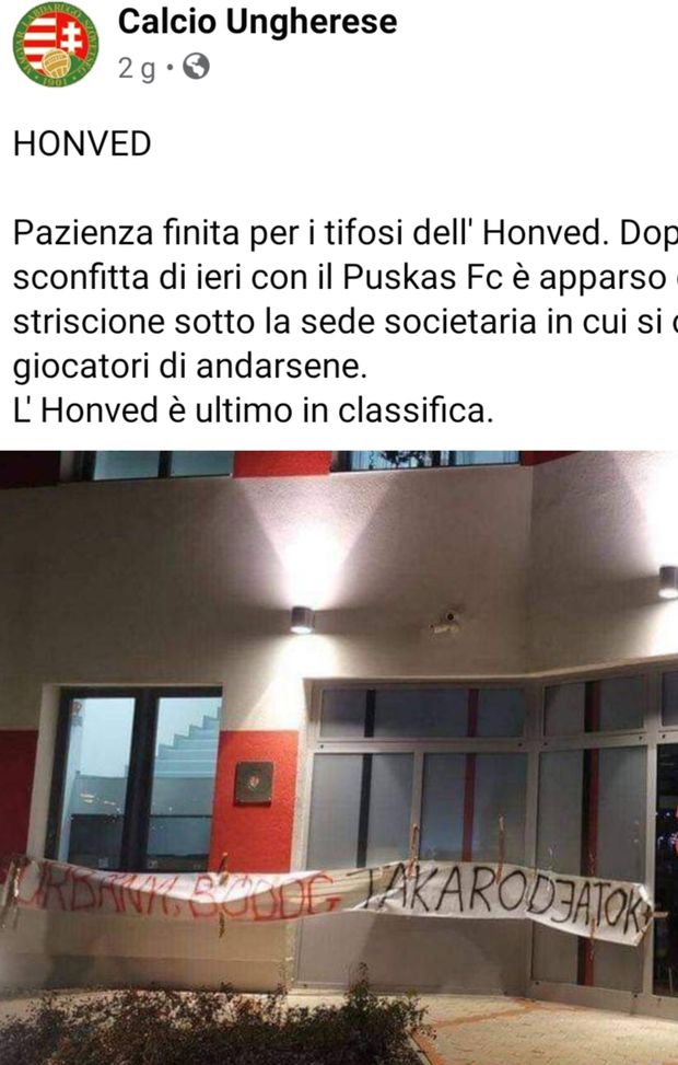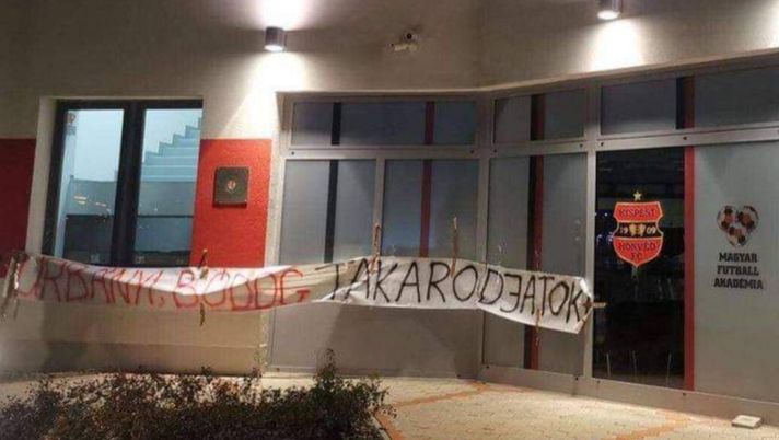 La mitica Honved di Puskas, Kocsis e Czibor non c'è più. Oggi perde sempre e i tifosi hanno messo lo striscione davanti alla sede del club...