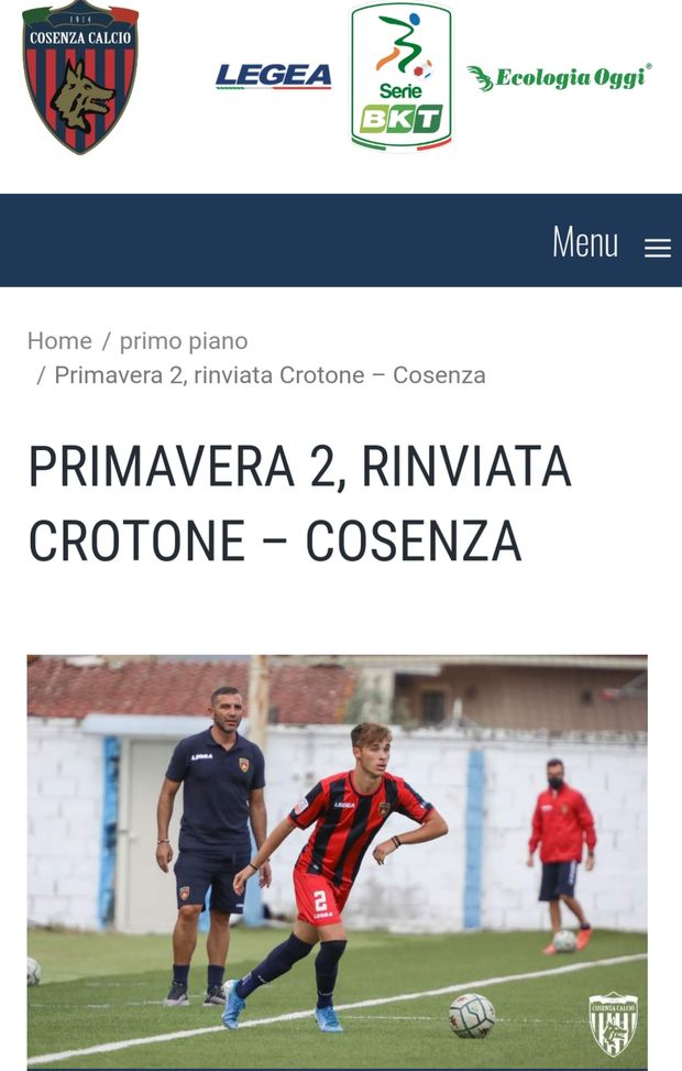 Di seguito la nota pubblicata dal club cosentino: "La Lega Nazionale Professionisti B, attraverso il Comunicato Ufficiale N. 55 del 28 ottobre 2020, ha reso noto il rinvio a data da destinarsi della gara tra Crotone e Cosenza, valevole per la quarta giornata d’andata del Campionato Primavera 2 2020/2021".