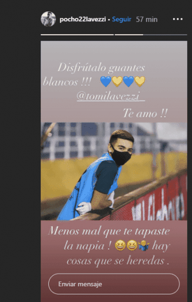 Al primo appuntamento della Copa de la Superliga, intanto, El Pocho non ha perso l’occasione per dedicare una storia su Instagram al figlio. “Divertiti, guanti bianchi !!! Ti amo !! Meno male che hai coperto il tuo naso! Ci sono cose che si ereditano”, ha scritto l’ex attaccante di Napoli, Paris Saint-Germain e Hebei Fortune, fedele al suo stile. Nella foto postata da Ezequiel si vede appunto Tomás con la mascherina e i guanti nelle mani per prevenire il coronavirus. Buon sangue non mente.