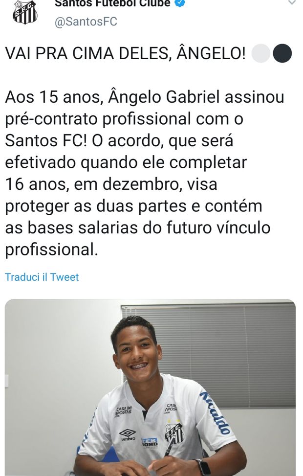 Nella settimana dell'80esimo compleanno di Pelè, spicca la storia dell'esterno offensivo 15enne Angelo che appena 24 ore dopo essersi allenato per la prima volta con la prima squadra del Santos (a soli 15 anni, 10 mesi e 2 giorni) ha firmato il suo primo pre-contratto col club paulista. Così potrà viaggiare nel fine-settimana a Rio de Janeiro insieme ai nuovi compagni per affrontare il Fluminense al "Maracanã" nel prossimo turno di campionato.