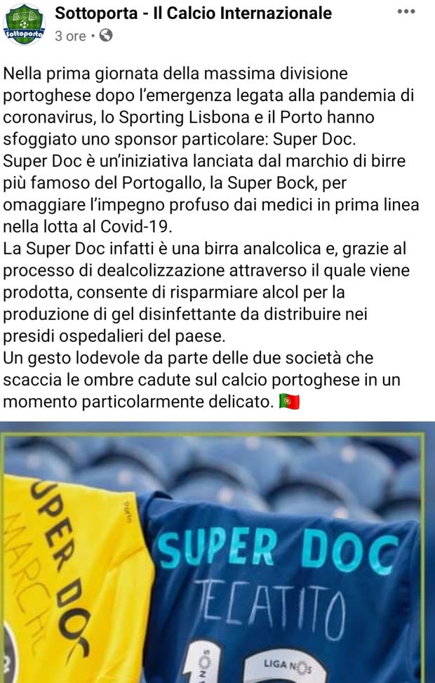 Pertanto, nella partita contro il Famalicão per la 25esima giornata round della Liga portoghese , il Porto è entrato in campo con le maglie su cui erano stampati i nomi dei dipendenti degli ospedali portoghesi che si fanno riconoscere da colleghi e pazienti, grazie al loro nome in evidenza sulle mascherine. Inoltre, il Porto ha momentaneamente cambiato il logo della birra "Super Bock" in "Super Doc" in riferimento agli operatori sanitari che si trovano ad affrontare Covid-19: da questa birra si ricava infatti gel igienizzante. Tuttavia, nonostante la buona iniziativa, i Draghi non sono riusciti a superare il Famalicão. Pertanto, i biancoblu hanno perso 2-1 , ma, grazie al pareggio casalingo del Benfica, sono rimasti in testa alla Liga classifica.
