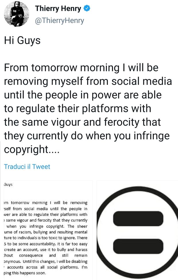 "Ciao ragazzi, da domani mattina mi rimuoverò dai social media fino a quando le persone ai vertici dei social stessi non saranno in grado di regolare le loro piattaforme con lo stesso vigore e ferocia che fanno attualmente quando si viola il copyright...". E' questa la presa di posizione forte da parte di Thierry Henry.