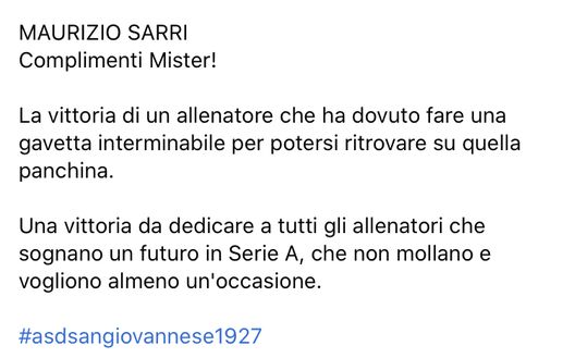 Il primo aretino a vincere il campionato di Serie A, inoltre, ha ricevuto gli auguri social anche della Sangiovannese, da lui portata in C1: “Complimenti mister! La vittoria di un allenatore che ha dovuto fare una gavetta interminabile per potersi ritrovare su quella panchina. Una vittoria da dedicare a tutti gli allenatori che sognano un futuro in Serie A, che non mollano e vogliono almeno un’occasione”.