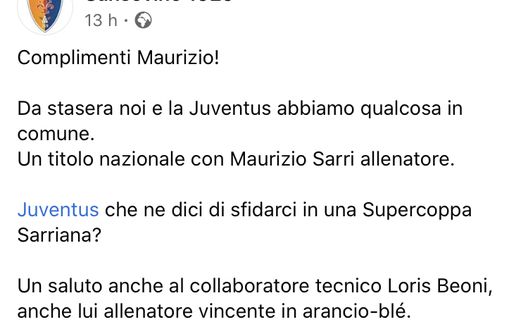 “Complimenti Maurizio! Da stasera (ieri, ndr) noi e la Juventus abbiamo qualcosa in comune. Un titolo nazionale con Maurizio Sarri allenatore. Juventus che ne dici di sfidarci in una Supercoppa Sarriana? Un saluto anche al collaboratore tecnico Loris Beoni, anche lui allenatore vincente in arancio-blé”.