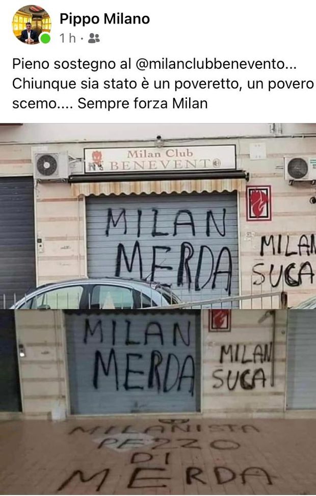Il Milan alla vigilia della gara con il Benevento, all'arrivo in città, ha ricevuto una straordinaria accoglienza nella città delle Streghe, da parte dei tifosi milanisti. Stamane, però, un cattivo risveglio: sede del Milan Club Benevento imbrattata con delle scritte offensive oltre che volgari.