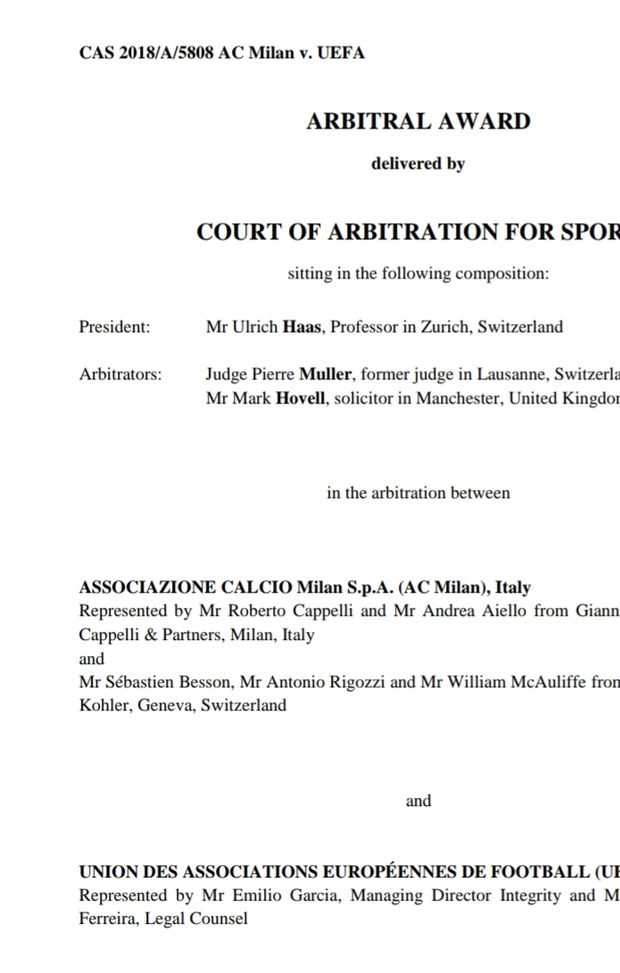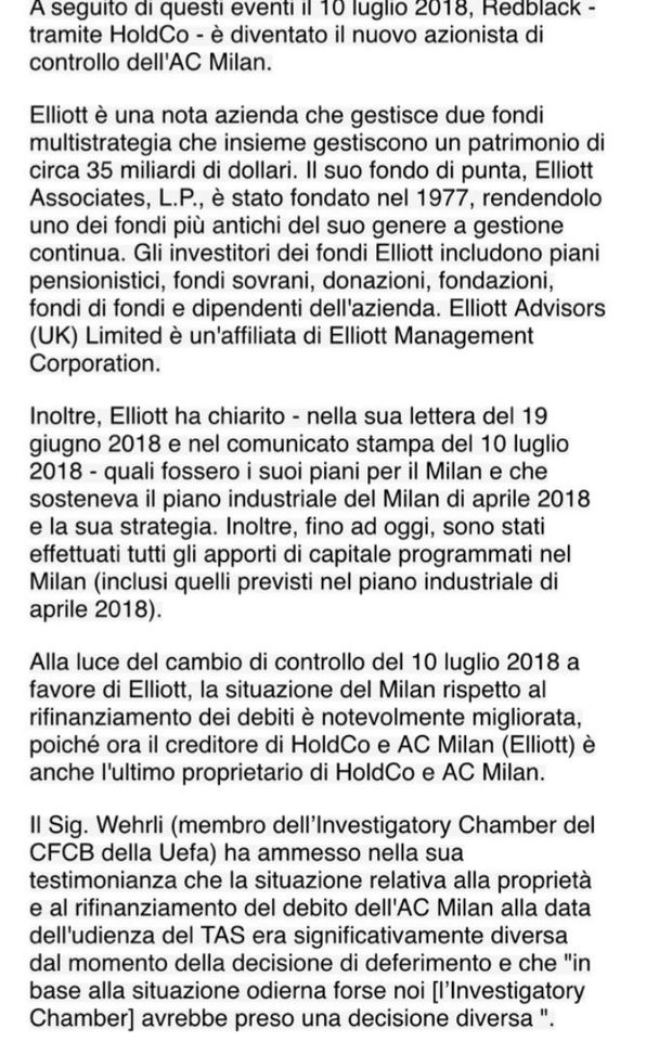L’ultima ricostruzione del sito specializzato “Calcioefinanza” è una pietra tombale sul reticolo finanziario attraverso il quale Elliott è riconoscibile come effettivo proprietario del Milan in forza del 97% delle azioni. Esiste un secondo documento che "Derbyderbyderby" è in grado di riprodurre e che chiude il cerchio. La sentenza del Tas di Losanna datata luglio 2018 con la quale venne congelata la punizione inflitta al Milan in materia di Financial Fair Play dall’Uefa recita testualmente così: l’arrivo del nuovo azionista Elliott ha radicalmente cambiato la situazione del club e rimosso i dubbi dell’Uefa, posizione confermata dal capo investigativo della federazione europea.